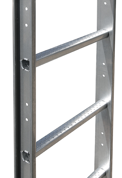 Сборная штампованная лестница со стандартными настраиваемыми кронштейнами. Закругленные трапецевидные перекладины имеют большую площадь соприкосновения и более рельефную текстуру для безопасного подъема по лестнице. Конструкция лестницы по своим стандартам превосходит нормы OSHA США. Защитное ограждение входит в комплект лестницы для бункеров с высотой заполнения более, чем 7,6 м.